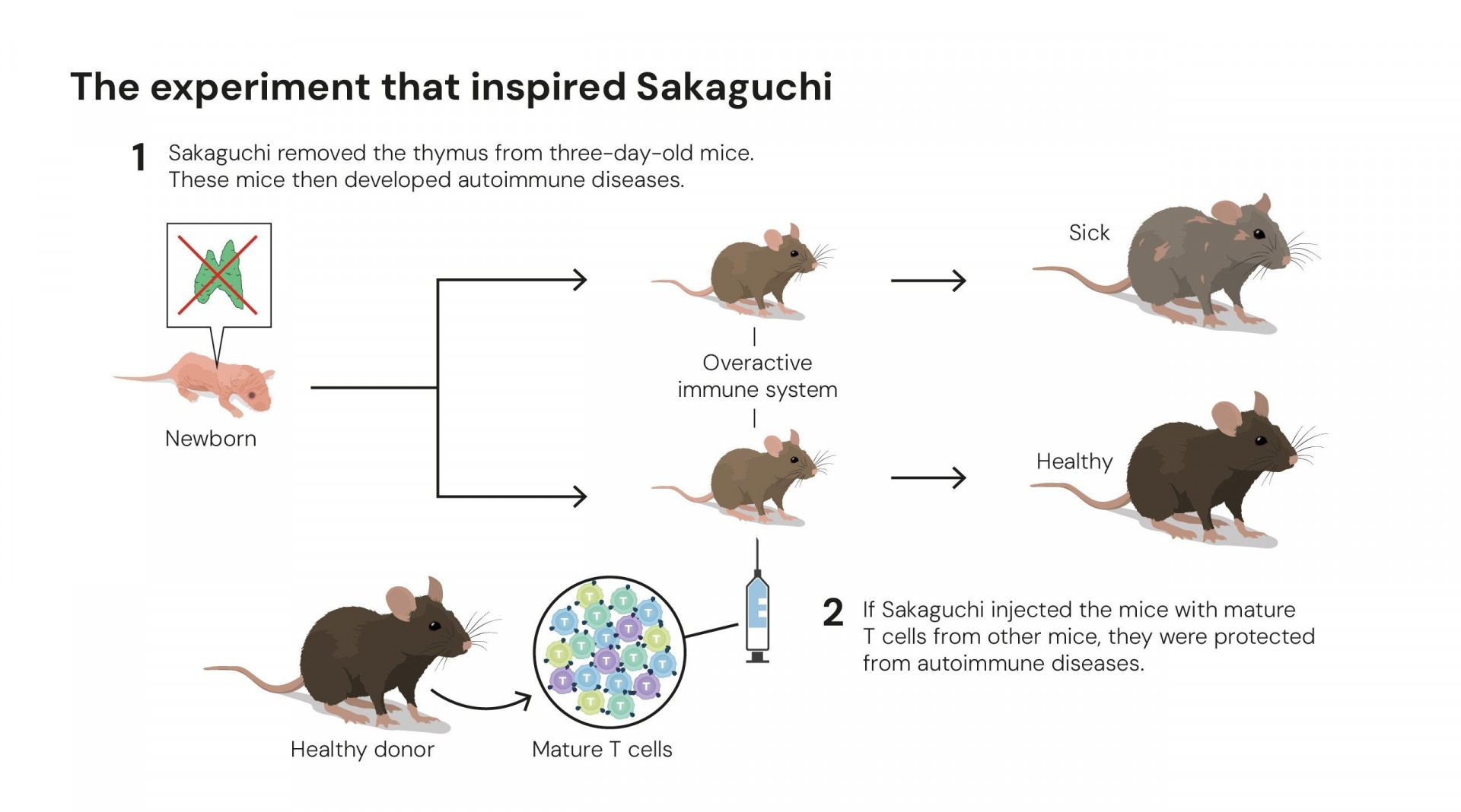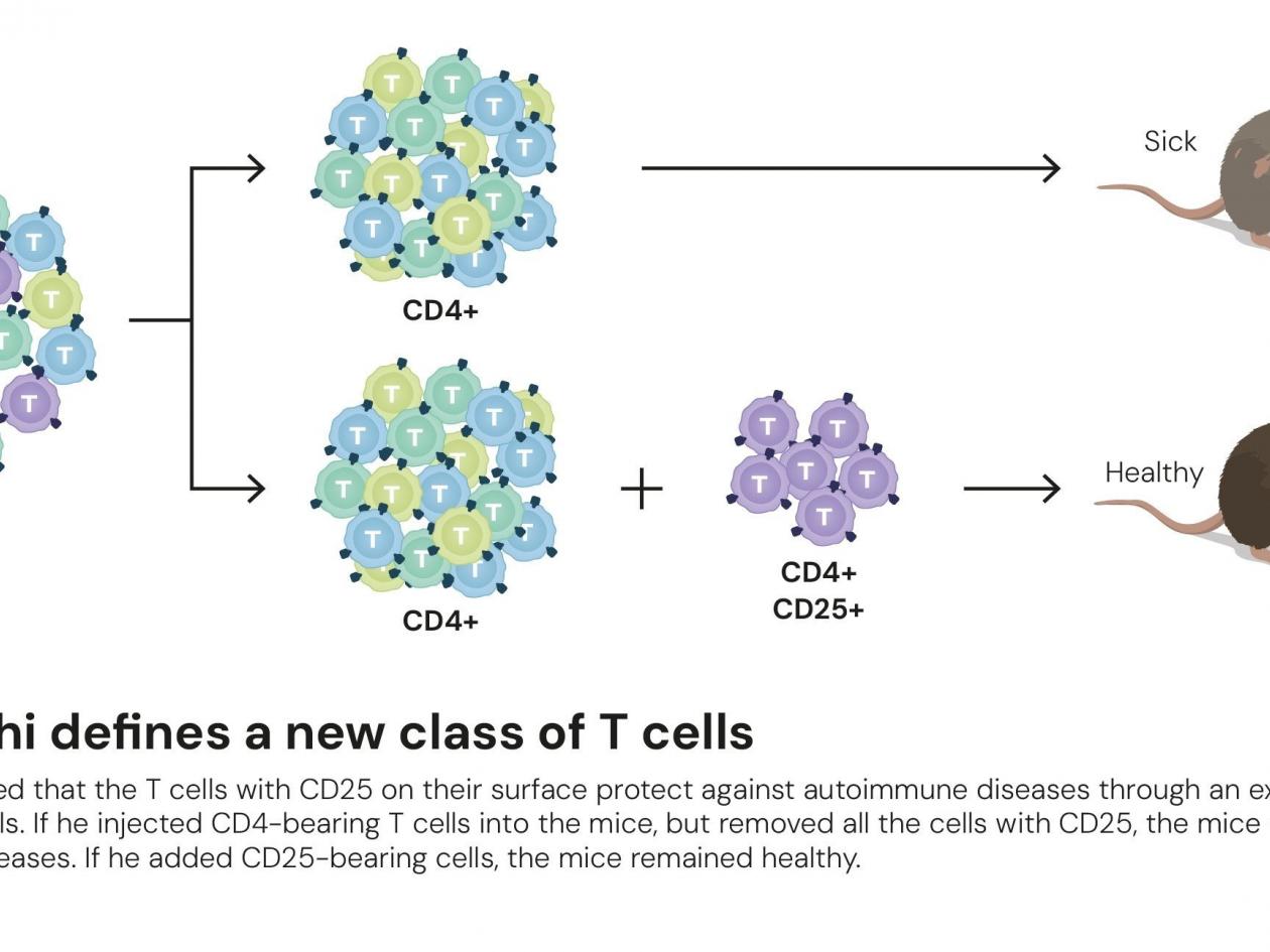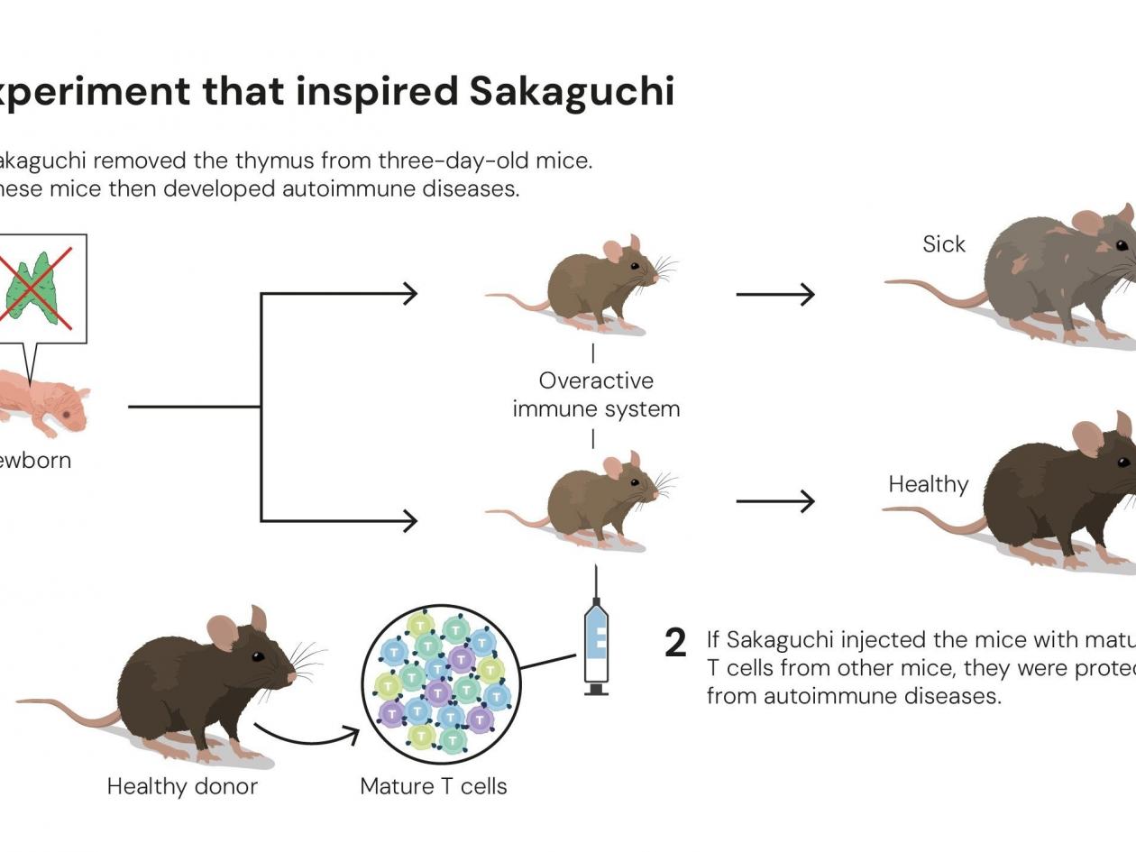 Ο Sakaguchi αναγνώρισε για πρώτη φορά τα ρυθμιστικά Τ κύτταρα (Tregs) τη δεκαετία του 1990, ανοσοκύτταρα που καταστέλλουν την υπερβολική ανοσολογική δραστηριότητα. Οι Brunkow και Ramsdell αργότερα ανακάλυψαν ότι αυτά τα κύτταρα ελέγχονται από ένα γονίδιο που ονομάζεται FOXP3. Οι μεταλλάξεις σε αυτό το γονίδιο προκαλούν σοβαρές αυτοάνοσες ασθένειες, όπως το σύνδρομο IPEX, επιβεβαιώνοντας τον κεντρικό του ρόλο στη ρύθμιση του ανοσοποιητικού συστήματος.